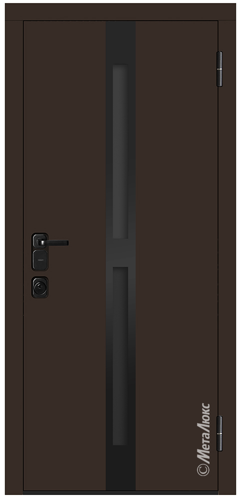 - Отделка снаружи: влагостойкая панель МДФ высокой плотности 16 мм, эмаль, цвет "Горький шоколад" (цвет на выбор), стеклопакет (пескоструй), черные металлические вставки