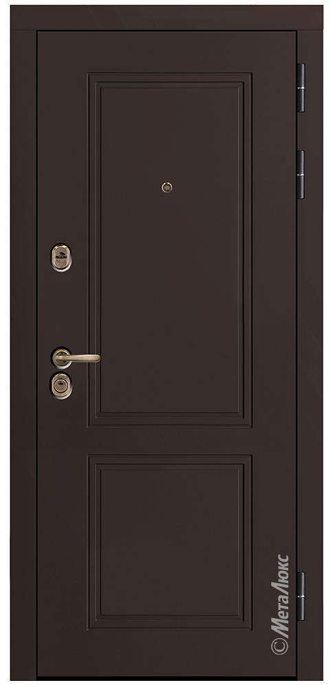 | ОСОБЕННОСТИ КОНСТРУКЦИИ | • Усиленные петли на подшипниках • Усиление зоны петель легированным металлом квадратного сечения • Усиление замковой части металлическим карманом • Эксцентрик •Уникальный конусообразный гиб полотна •Дополнительную жесткость конструкции придает особое расположение ребер ( 2 вертикальных, 2 горизонтальных) •Противосъемные ригеля, диаметром 16 мм (3 шт.), исключают вероятность взлома путем среза петель •Особый профиль полотна (края полотна завальцованы, что придает дополнительную жесткость и исключает возможность вскрытия двери силовым отжимом) •Безмолдинговая система крепления внутренней панели позволяет добиться безупречного внешнего вида изделия. Особая конфигурация профиля полотна дает возможность осуществить замену внутренней панели при необходимости |